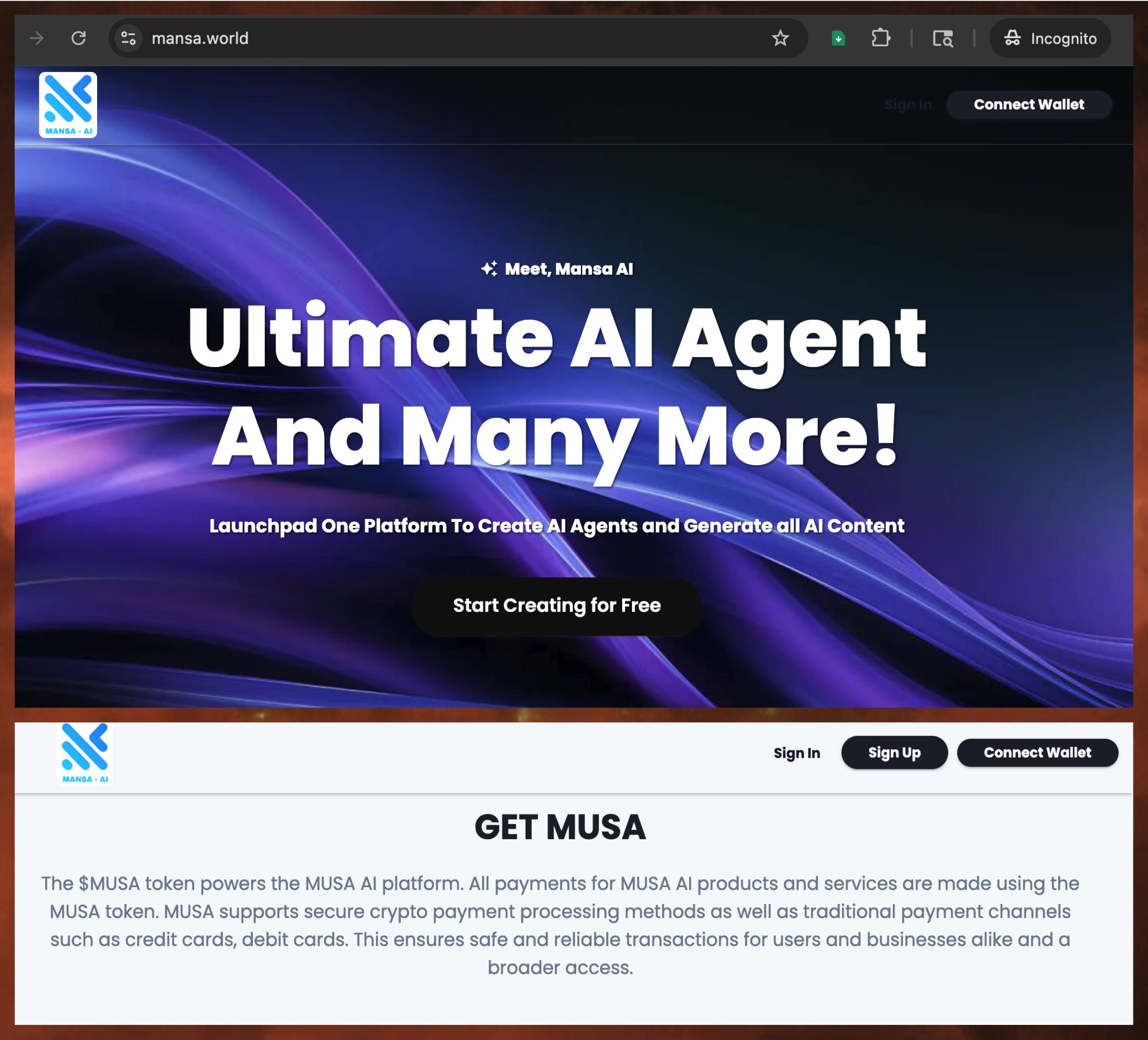 The website linked from Mansa Agents Craft’s profile, mansa(dot)world, purports to provide “…one platform to create AI agents and generate all AI content”. The types of AI-generated content allegedly available include chatbots, images, voiceovers, articles, and more. The fine print on the website reveals that using the site’s services requires paying with an obscure cryptocurrency token, $MUSA, and most screens on the site have a prominent “Connect Wallet” button displayed in the upper right corner.