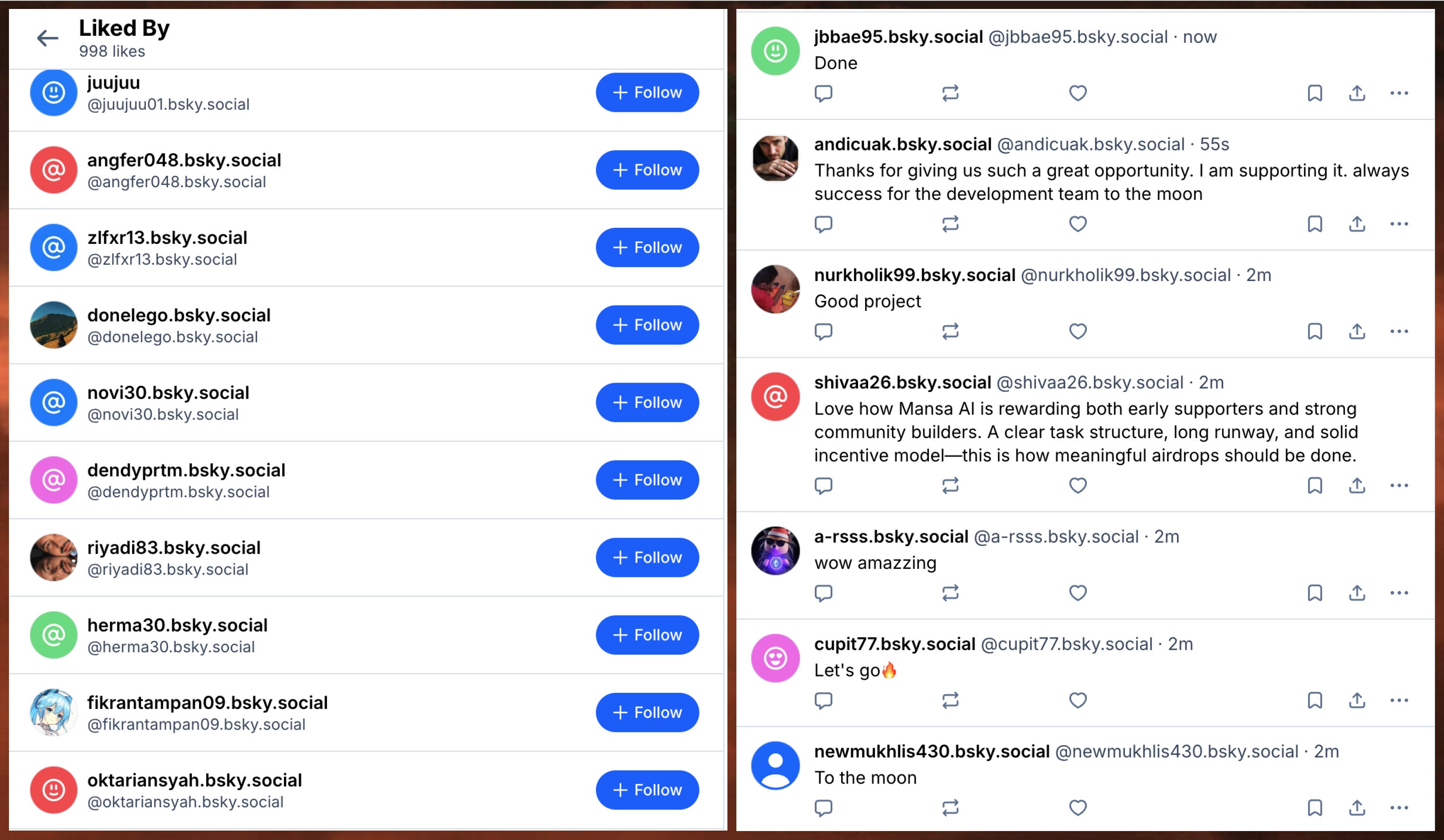 On December 15th, 2025, a Bluesky account by the name of “Mansa Agents Craft” (@agentscraft.bsky.social) posted a video advertising an “enterprise-grade Web3 platform”, which was rapidly reposted by a large number of spam accounts. The accounts that amplified the Mansa Agents Craft post are part of a spam network consisting of thousands of accounts that also amplified a handful of other Bluesky posts around the same time, including both cryptocurrency and music-related content. In the days since, both the Mansa Agents Craft account and the majority of the spam accounts promoting it have been suspended, although some of the other posts amplified by the network are still online.
