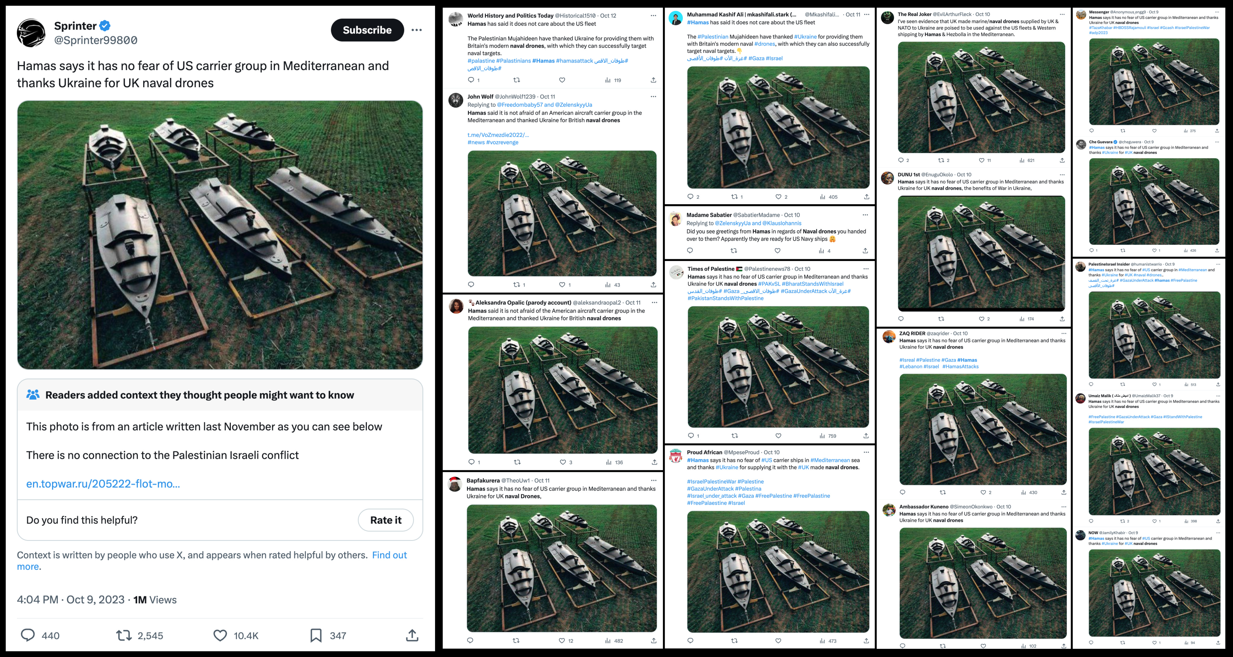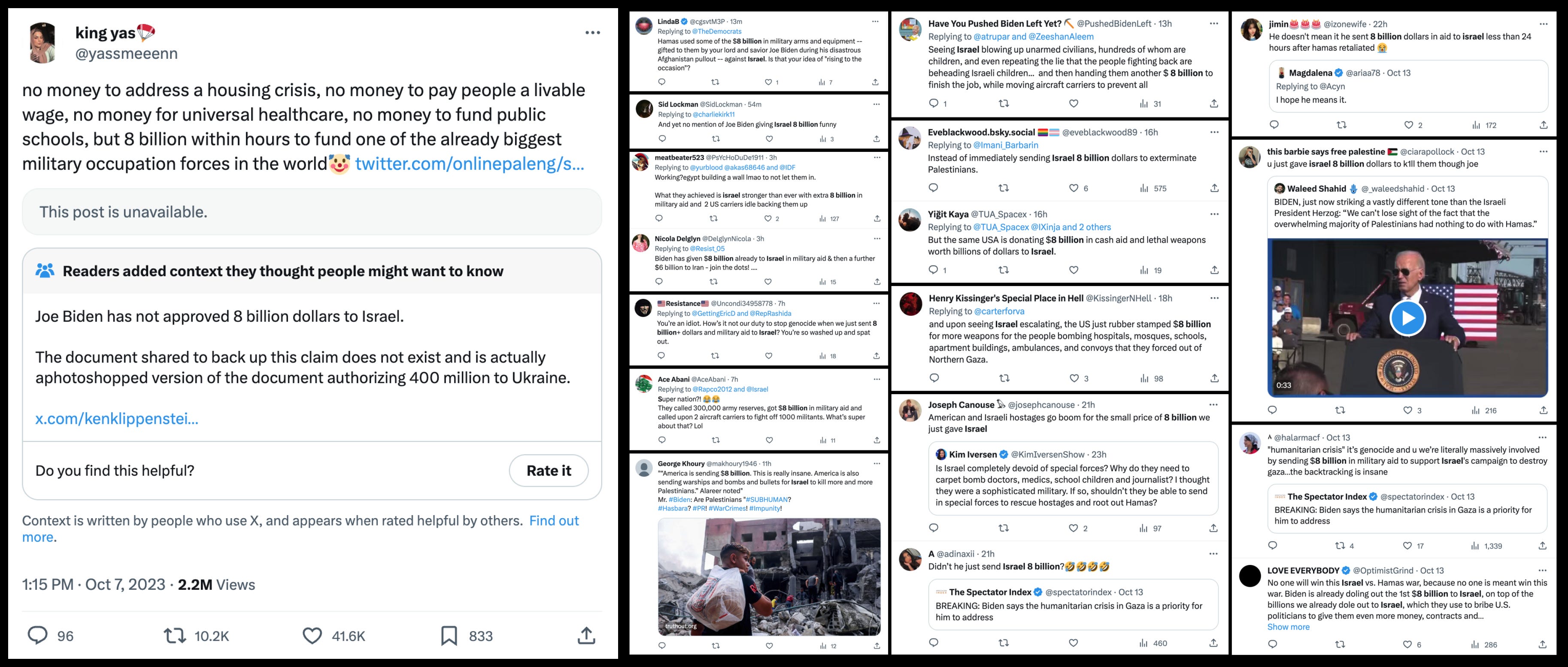 The recent violence in Israel and Gaza has been accompanied by a surge of misleading and false claims on social media platforms such as X/Twitter regarding various aspects of the war. Although X’s crowdsourced Community Notes fact checking system has resulted in some of the most popular false posts being labeled with additional context, it has struggled in multiple ways to address the flood of misinformation regarding the war. The sheer volume of posts has overwhelmed the pool of volunteers who write and rate notes, posts often go viral quite quickly and rack up massive engagement before notes appear, and the system is most effective at labeling individual popular posts and does not scale well to situations where a misleading claim ends up being repeated by large numbers of small accounts (organic or otherwise). Additionally, many of the accounts with viral false posts about the war are X Premium (Twitter Blue) subscribers, who may have a financial incentive to leave debunked posts online due to X’s ad revenue sharing feature.