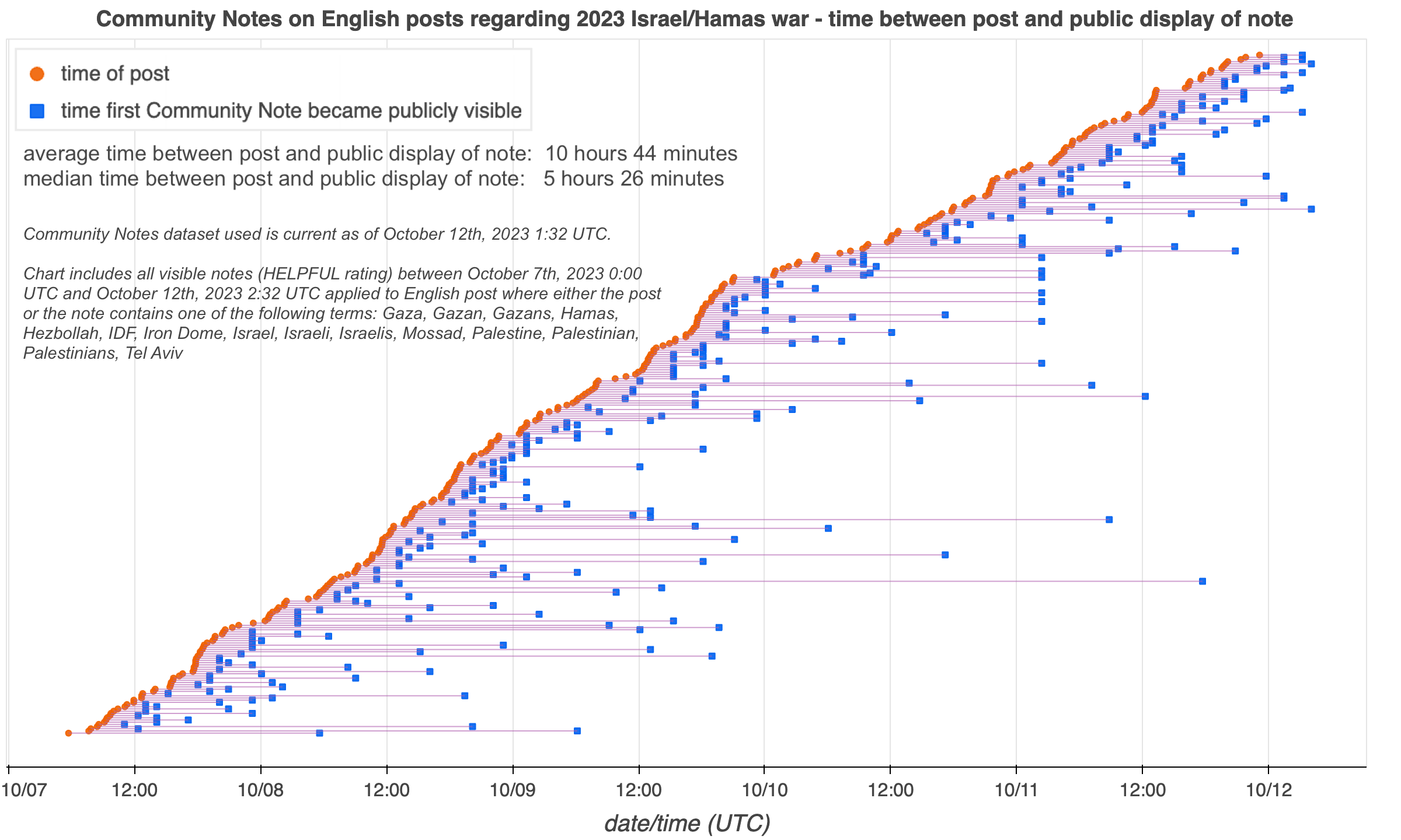 The complete set of proposed notes and their rating history are publicly available for download and analysis. The available data generally lags a couple days behind the current state of the platform; all numbers in this article are based on Community Notes data that is complete through October 12th, 2023 at 1:32 UTC. Content likely to be related to the war was detected by filtering the dataset to notes attached to English-language posts where the text of the note or post contained at least one relevant keyword, which resulted in 4008 proposed notes on 2037 posts. (Keywords used: Gaza, Gazan, Gazans, Hamas, Hezbollah, IDF, Iron Dome, Israel, Israeli, Israelis, Mossad, Palestine, Palestinian, Palestinians, Tel Aviv.)