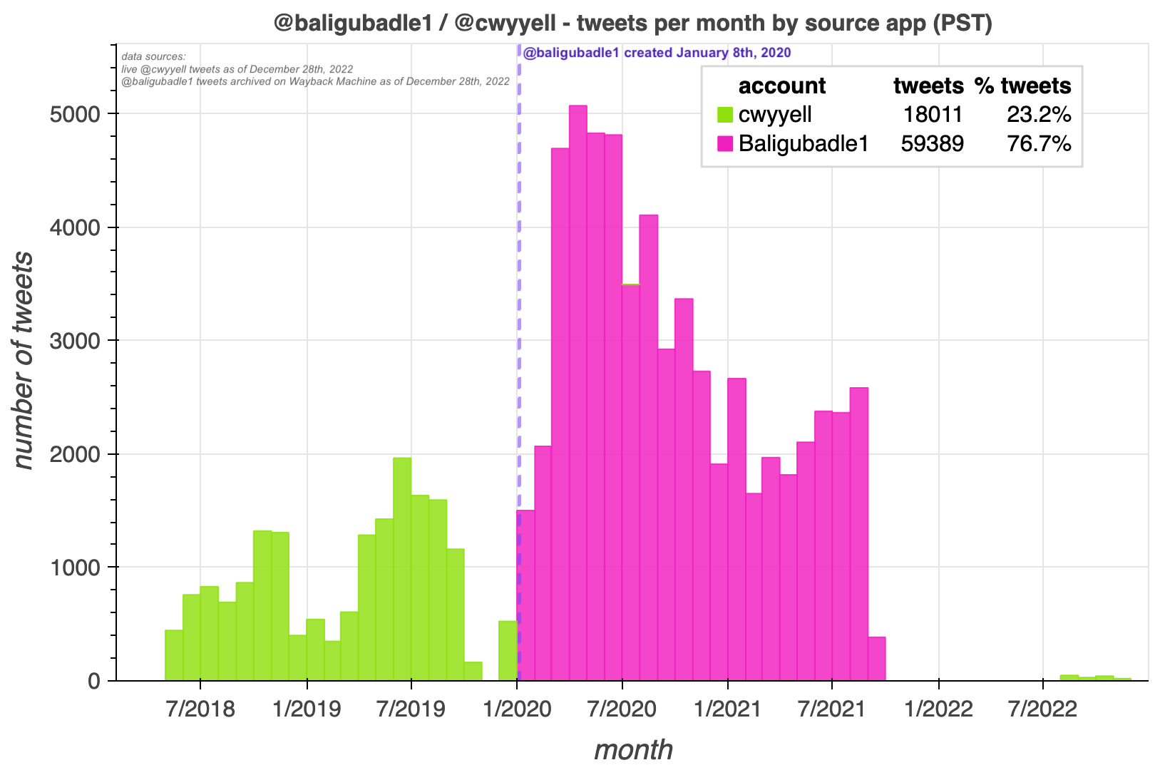 The @cwyyell account was created in May 2018 and continued to tweet with some regularity up until the creation of the @Baligubadle1 account, at which point the @cwyyell account went almost totally silent until late 2022, when @Baligubadle1 was no longer active. Although this could simply be a remarkable coincidence of timing, it also suggests the possibility that the same person or entity ran both accounts and decided to switch from a Kenya-based to a U.S.-based persona for the 2020 U.S. election season. The @cwyyell account’s objection to the @Baligubadle1 account’s suspension and @cwyyell’s apparent familiarity with the actual town of Baligubadle are additional data points consistent with this explanation. An operator on a different continent would also explain the @Baligubadle1 account’s lack of familiarity with North American time zones.