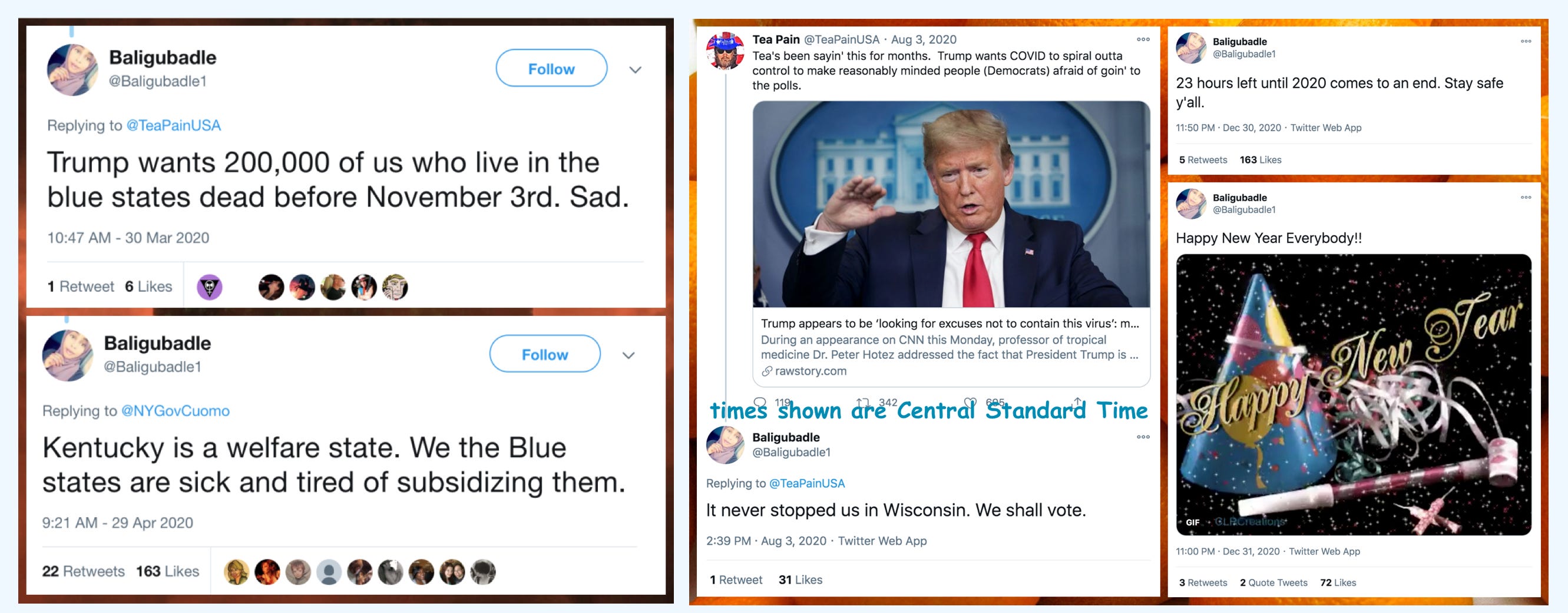 On multiple occasions, @Baligubadle1 also posted tweets claiming or implying residence in a U.S. state, in the form of both general references to “blue states” and a specific reference to voting in Wisconsin. There is a discrepancy, however: the @Baligubadle1 account reliably marked midnight in U.S. Eastern Time, but the entirety of the state of Wisconsin is in U.S. Central Time.