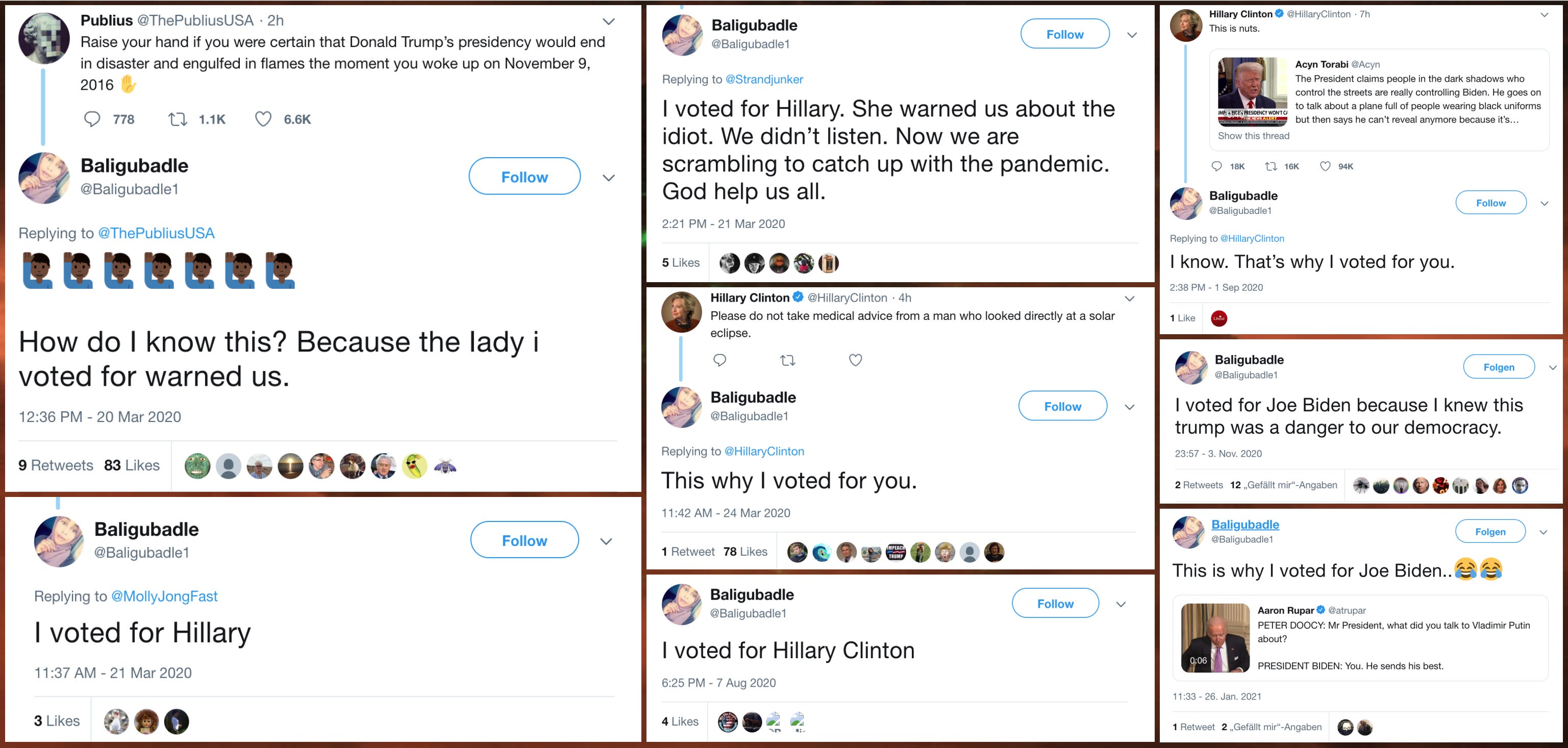 The @Baligubadle1 account regularly claimed to have voted in U.S. elections, implying that the operator of the account was an adult U.S. citizen. The account holder allegedly voted for Democrats in both the 2016 and 2020 presidential elections, and generally expressed support for Democratic candidates for other offices.