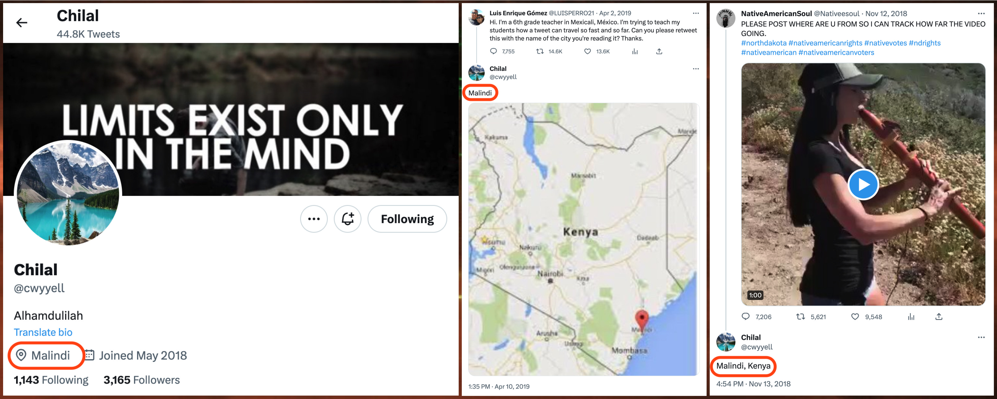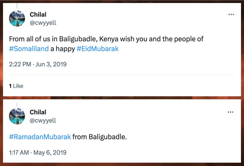 Unlike the @Baligubadle1 account, which claimed to be a U.S. voter based in the United States, the operator of the @cwyyell account has repeatedly claimed to be located in various places in East Africa, usually Malindi, Kenya. In an interesting coincidence, @cwyyell has apparently spent time in the town of Baligubadle, Somaliland, which shares a name with the banned @Baligubadle1 Twitter account.