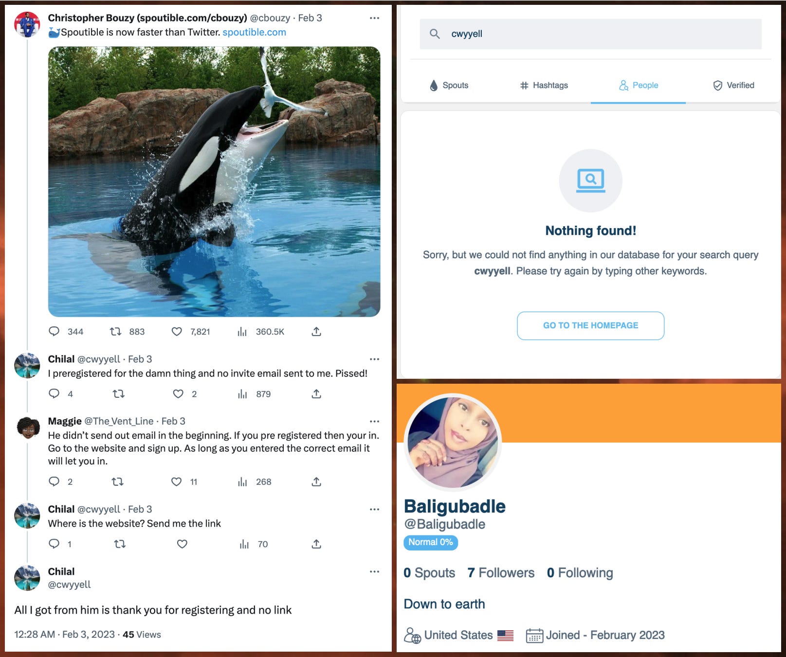In February 2023, the @cwyyell Twitter account tweeted at Spoutible CEO Christopher Bouzy about difficulties creating a Spoutible account. Although no account with the name cwyyell exists on Spoutible, an empty Baligubadle account was created there around the same time, sporting the same profile photo as the now-suspended @Baligubadle1 Twitter account. It’s always possible that this is yet another coincidence in a growing set of coincidences, but it’s one more data point that is consistent with the hypothesis that the now-suspended @Baligubadle1 Twitter account was operated by the same person or entity as the @cwyyell account.