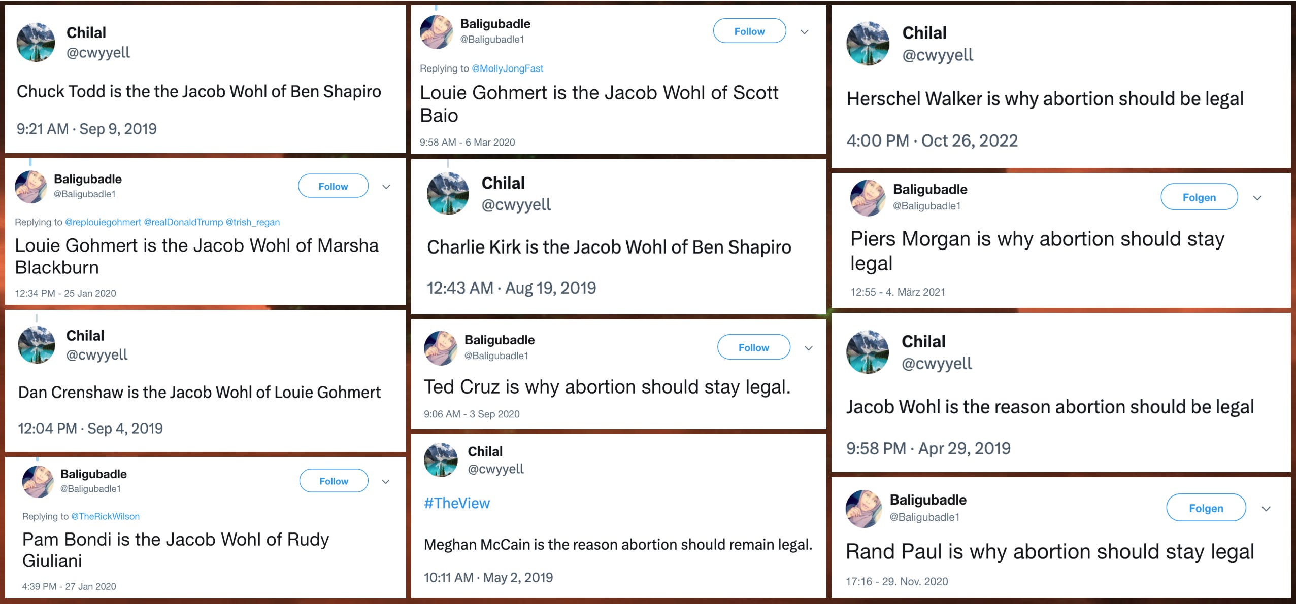 X is the reason why abortion should be/remain/stay legal (e.g., “Rand Paul is why abortion should stay legal”)
