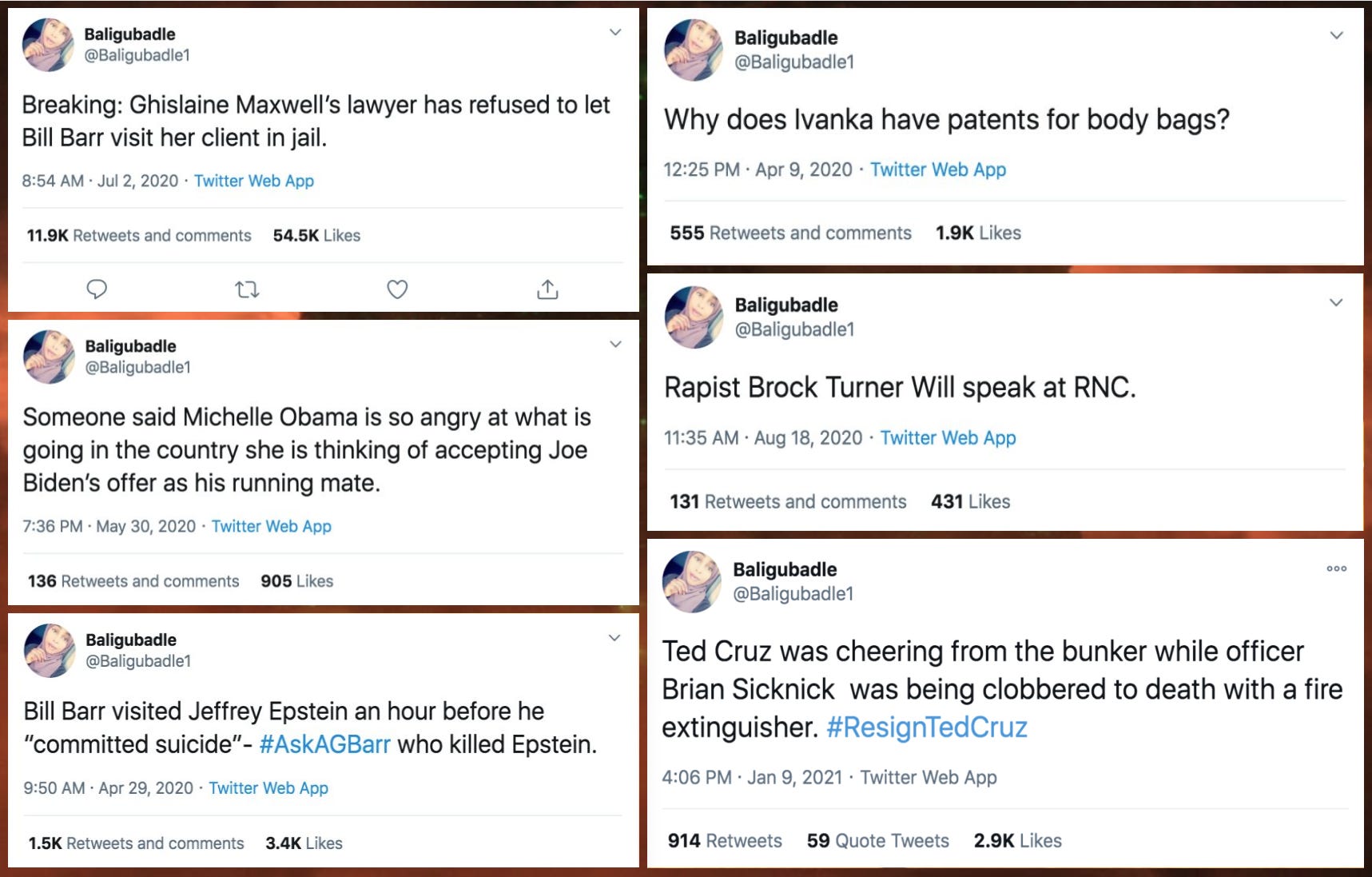 In January 2020, an allegedly US-based liberal Twitter account named @Baligubadle1 appeared and quickly gained popularity among anti-Trump #Resistance accounts. Over the course of the 2020 election cycle, this account picked up a variety of prominent followers and frequently went viral by posting misinformation, rumors, and assorted outrage bait. @Baligubadle1’s popular falsehoods included rumors about former U.S. Attorney General William Barr visiting Jeffrey Epstein and Ghislaine Maxwell in prison, an assertion that convicted rapist Brock Turner was scheduled to speak at the 2020 Republican National Convention, and a claim that Republican Senator Ted Cruz was “cheering from the bunker” while U.S. Capitol police officer Brian Sicknick was bludgeoned to death with a fire extinguisher. (In reality, Sicknick died of a stroke following being pepper sprayed at the January 6th, 2021 insurrection; his assailant was eventually sentenced to 6 years and 8 months in prison.)