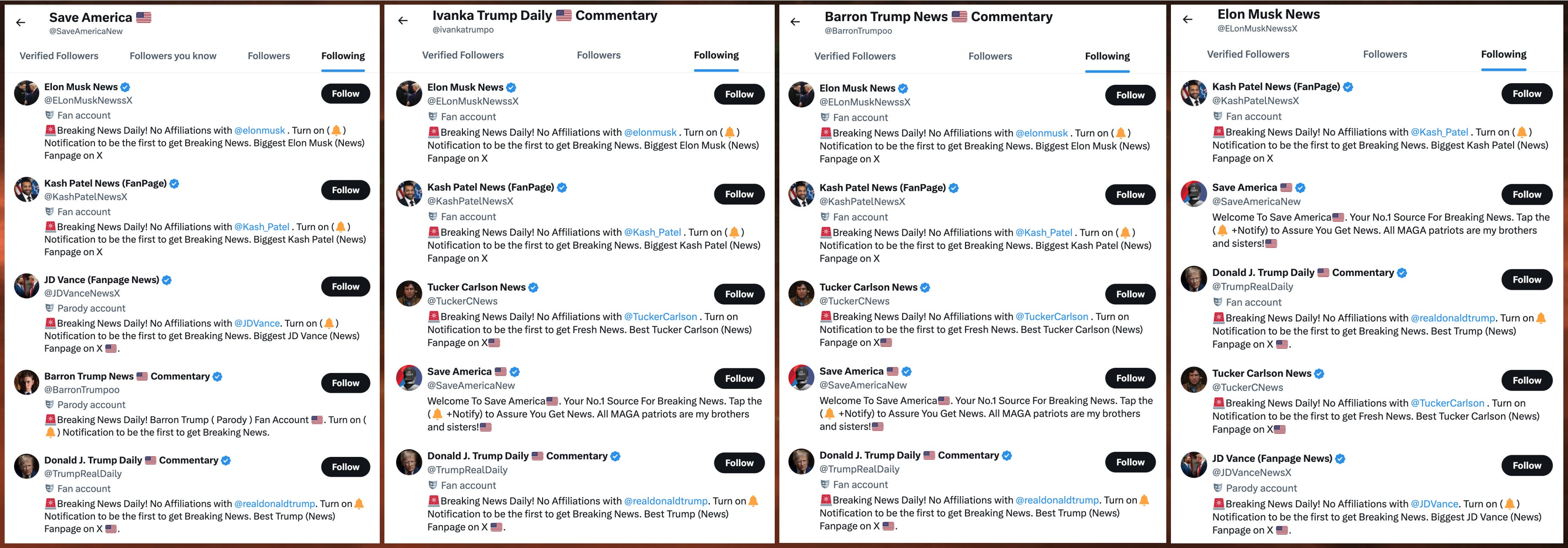 Over the last year or so, a network of blue-check X accounts with names like “Donald J. Trump News 🇺🇸 Commentary”, “Ivanka Trump Daily 🇺🇸 Commentary”, and “Elon Musk News” has been regularly posting repetitive pro-Trump engagement bait. Despite having no apparent connection to the Trump administration figures after which they are named, and engaging in no original news reporting, these accounts have amassed significant followings, with the largest, “JD Vance (Fanpage News)” having accrued over 888 thousand followers as of July 24th, 2025. Many of their posts have racked up significant engagement, frequently being reposted hundreds or thousands of times. Most of the accounts have “Fan account” or “Parody account” labels.