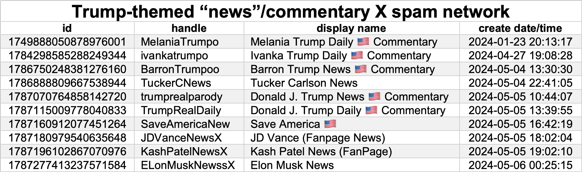 In addition to following one another, the accounts in the spam network also regularly repost and reply to each other’s spammy content. Most of the accounts repost both their own posts and those of every other account in the network; the “Melania Trump Daily 🇺🇸 Commentary” account (@MelaniaTrumpo) is excluded from the above table, as it was suspended by X while the relevant data was being gathered. Some of the spam accounts also repost the @usanews0 account mentioned earlier in this article, which itself reposts several of the spam accounts.