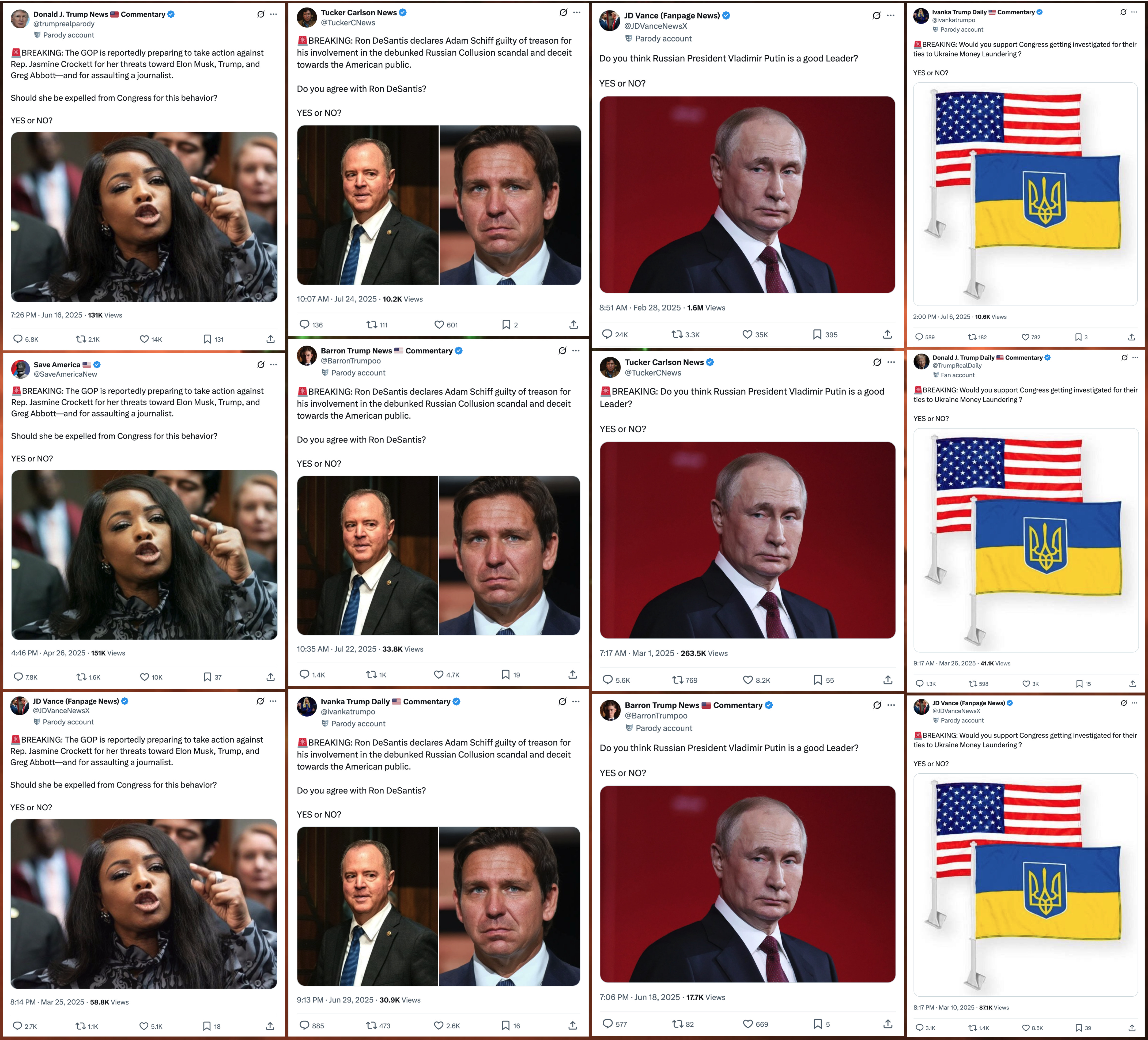None of these X accounts report news or have any connection to the public figures whose names they use, but their posts get a lot of engagement anyway