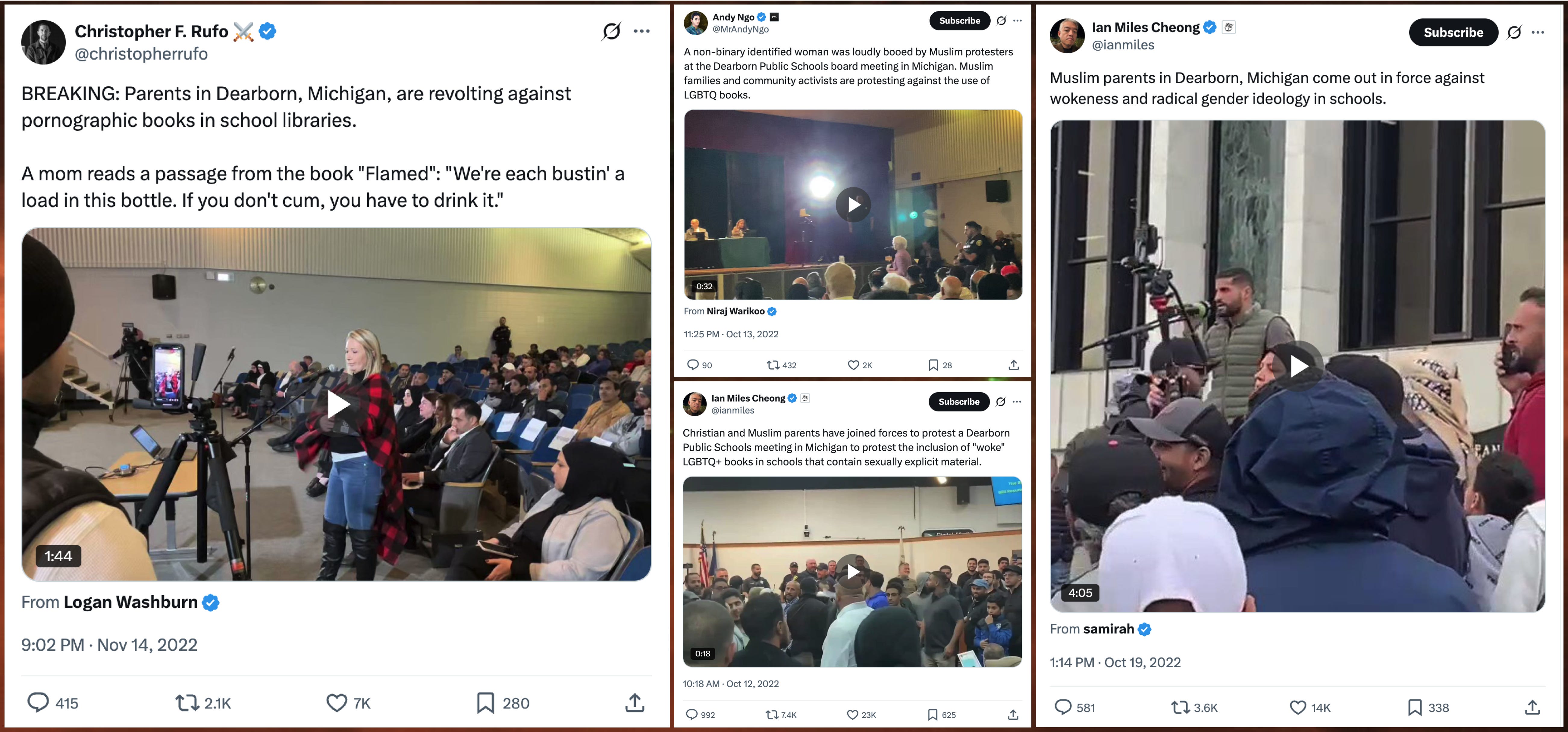 In a sudden reversal, numerous right-wing influencers pivoted temporarily to praising Dearborn in fall 2022 during efforts to ban various books with LGBTQ themes from public school libraries. Some of these posts specifically praise Muslim residents of Dearborn for participating in the efforts to remove the books in question, despite some of the posters having issued Islamophobic attacks against Dearborn on other occasions.