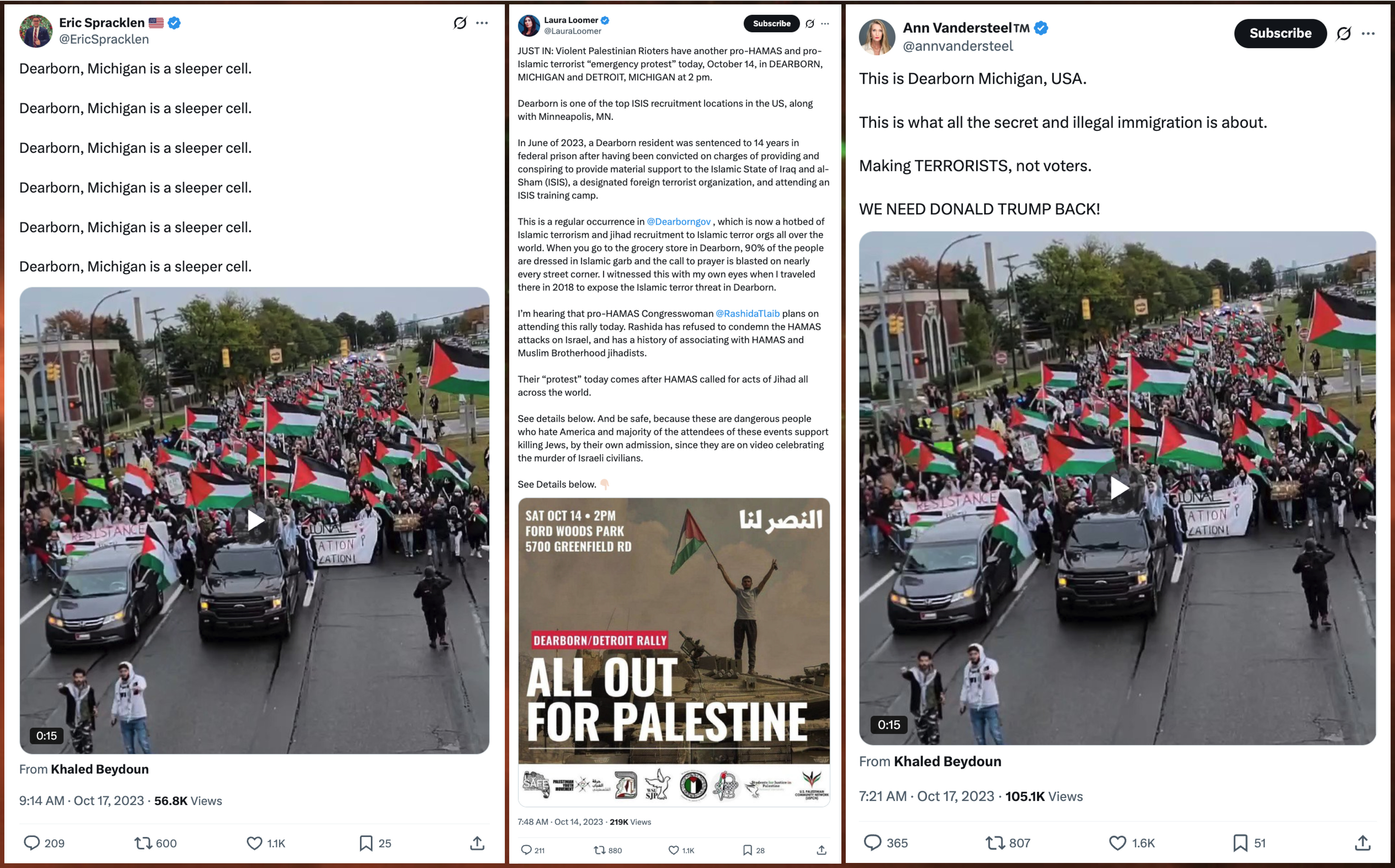 Right-wing Twitter (now X) influencers have been posting Islamophobic content about Dearborn for many, many years. Themes of these posts include fearmongering about sharia law, complaints about Muslims marching peacefully in public, and low-effort whining about a photo of a hijab-wearing cop standing next to a police vehicle. Occasional posts attacking Dearborn can be found throughout much of X’s history.
