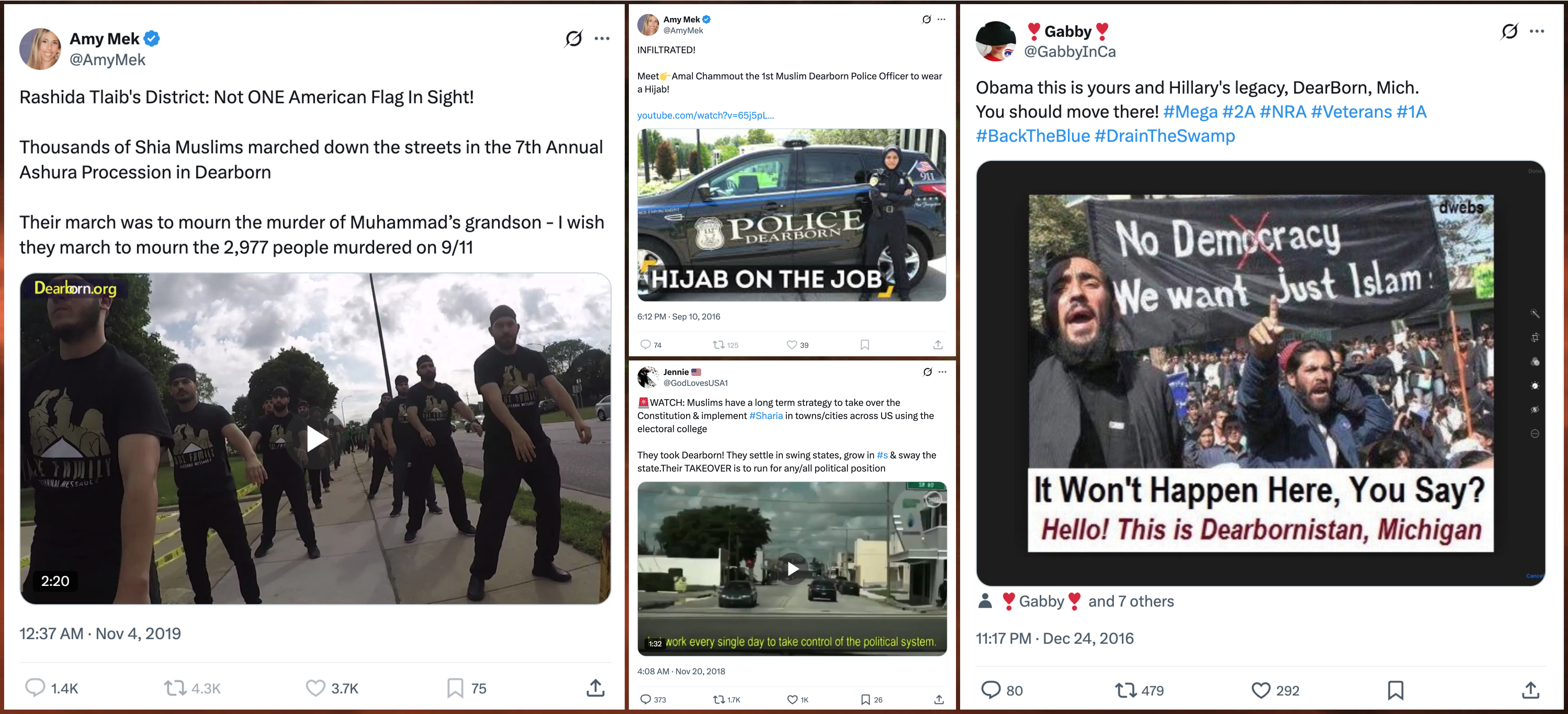 With a sizable population of residents of Middle Eastern descent and the largest Muslim population per capita of any city in the United States, Dearborn, Michigan has been frequently subject to racist and Islamophobic scapegoating on social media. Attacks over the years have ranged from insinuations that the city is home to terrorist sleeper cells to complaints about an on-duty police officer wearing a hijab.