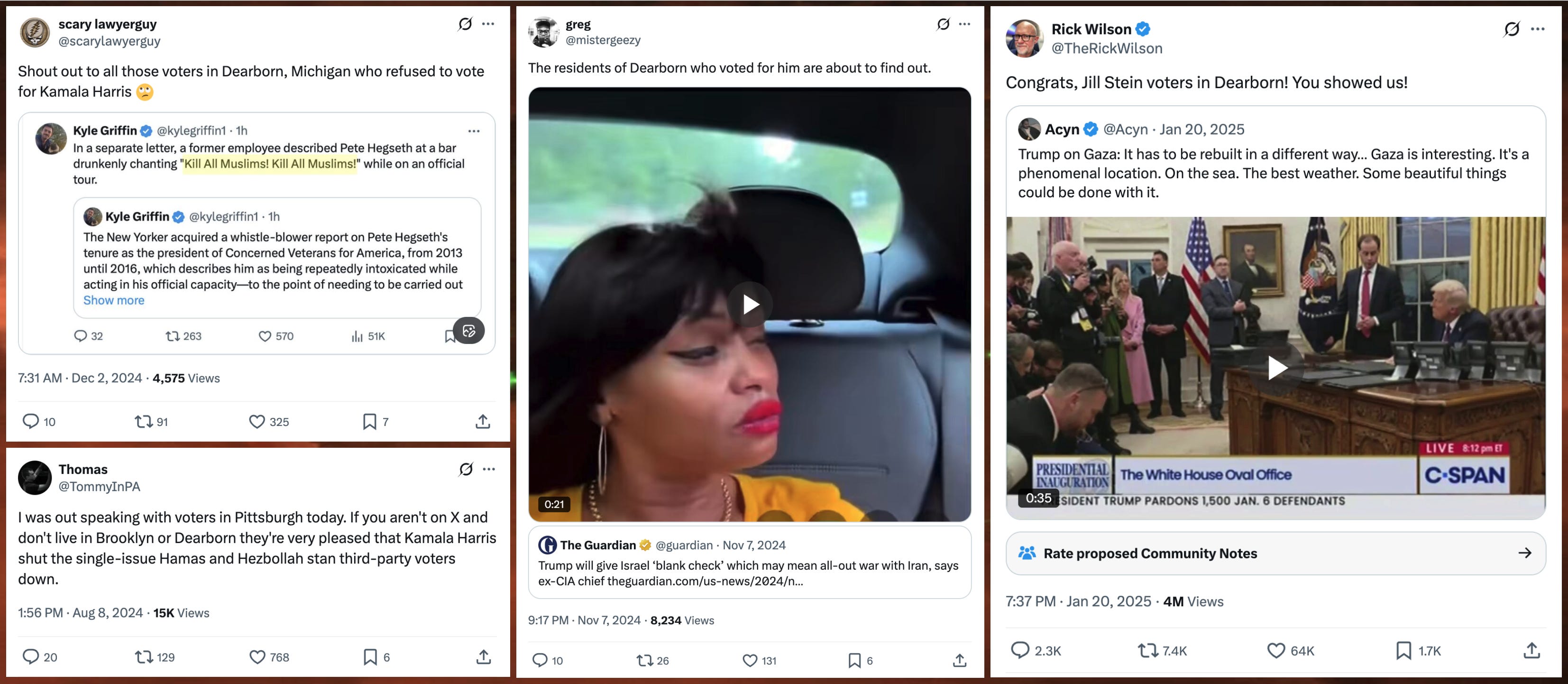 The 2024 U.S. election season brought the first wave of anti-Dearborn X posts driven significantly by liberal and anti-Trump accounts. These posts initially emerged in response to uncommitted votes during the primary, when former President Joe Biden was still running for re-election, but morphed into scapegoating over the general election outcome following Kamala Harris’s November 2024 loss. (Blaming Dearborn for the outcome is not based in mathematical reality, as even if every single eligible voter in Dearborn had voted for Harris, Trump would still have won the state of Michigan and the accompanying electoral votes.)