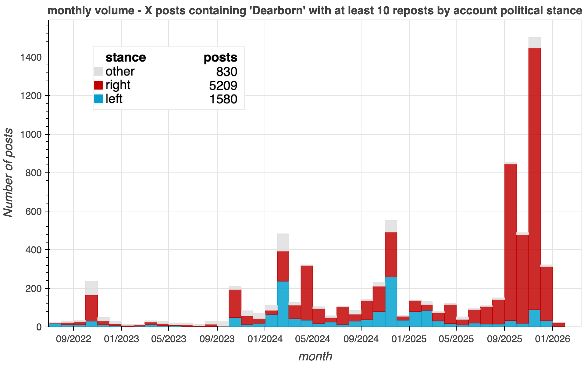 As seen in the graph of X posts above, the volume of this activity is not consistent; posts regarding Dearborn tend to occur in waves, and these waves are often triggered by major events that do not directly involve Dearborn. While these patterns of activity have historically been driven primarily by right-wing influencers, liberal participation increased significantly during the 2024 election season.