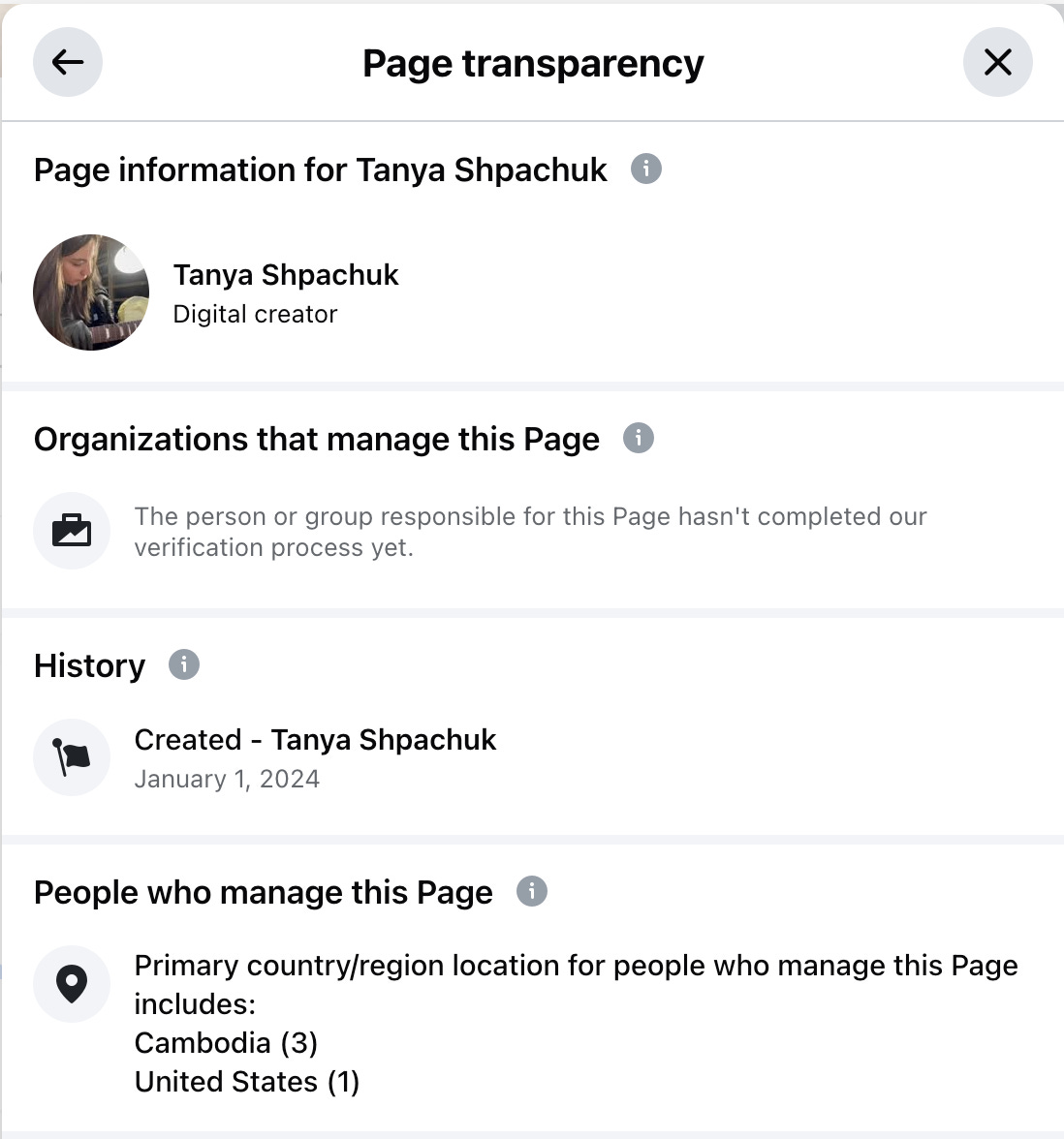 A quick look at the Page Transparency info for the most popular “Tanya Shpachuk” page on Facebook, which has 37K followers as of the time of this writing, reveals that the page was created on January 1st, 2024, and is managed from Cambodia and the United States. This is odd for a page allegedly belonging to someone in Kyiv, Ukraine, which is located nowhere in the vicinity of either of these two countries, and makes the absence of an administrator in Ukraine particularly notable. Unlike the YouTube and TikTok accounts, this Facebook page is not linked from Shpachuk’s official website.