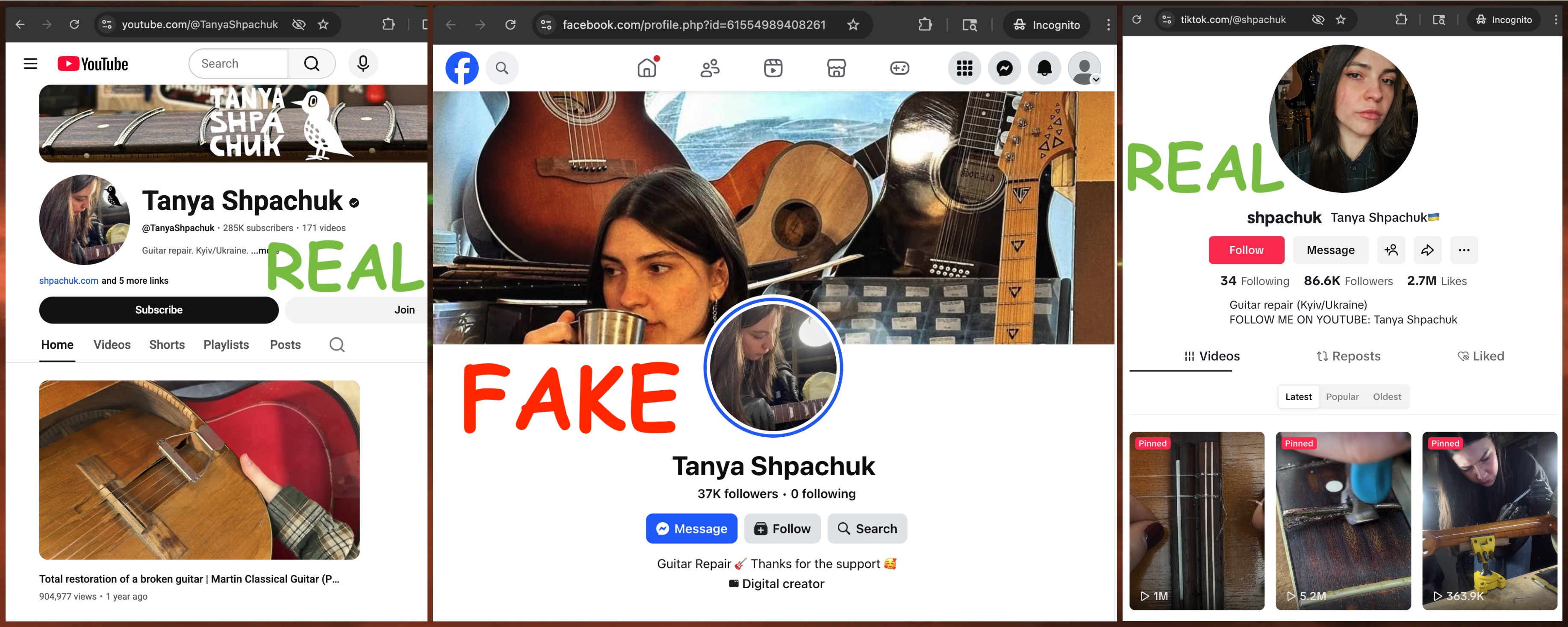 For the last few years, Tanya Shpachuk, the operator of a guitar repair business in Kyiv, Ukraine, has posted various videos of guitar restoration and repair on multiple social media platforms, primarily YouTube and TikTok. A series of videos documenting the process of restoring a Les Paul damaged by a Russian drone strike went particularly viral, and was featured in a recent article on guitarplayer.com. Not all of the social media accounts allegedly associated with Shpachuk or her business are legitimate, however; over on Facebook, the most popular “Tanya Shpachuk” page appears be a fake account operated from Cambodia.