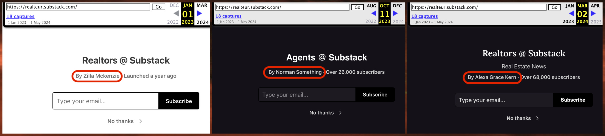 The “Realtors @ Substack” blog (located at realteur.substack.com) has been archived by Wayback Machine on multiple occasions over the course of 2023 and 2024, providing a look into the blog’s history. It turns out that the author didn’t always use the name “Alexa Grace Kern”; in early 2023, the blog was allegedly written by “Zilla Mckenzie”, and by the end of March 2023, the author’s name had been changed to “Norman Something”, before finally adopting the “Alexa Grace Kern” moniker no later than February 8th, 2024. Although Substack blogs can have multiple authors, we can tell that these are all the same author account because the permanent ID number, 45882377, remains the same even as the account’s display name changes.