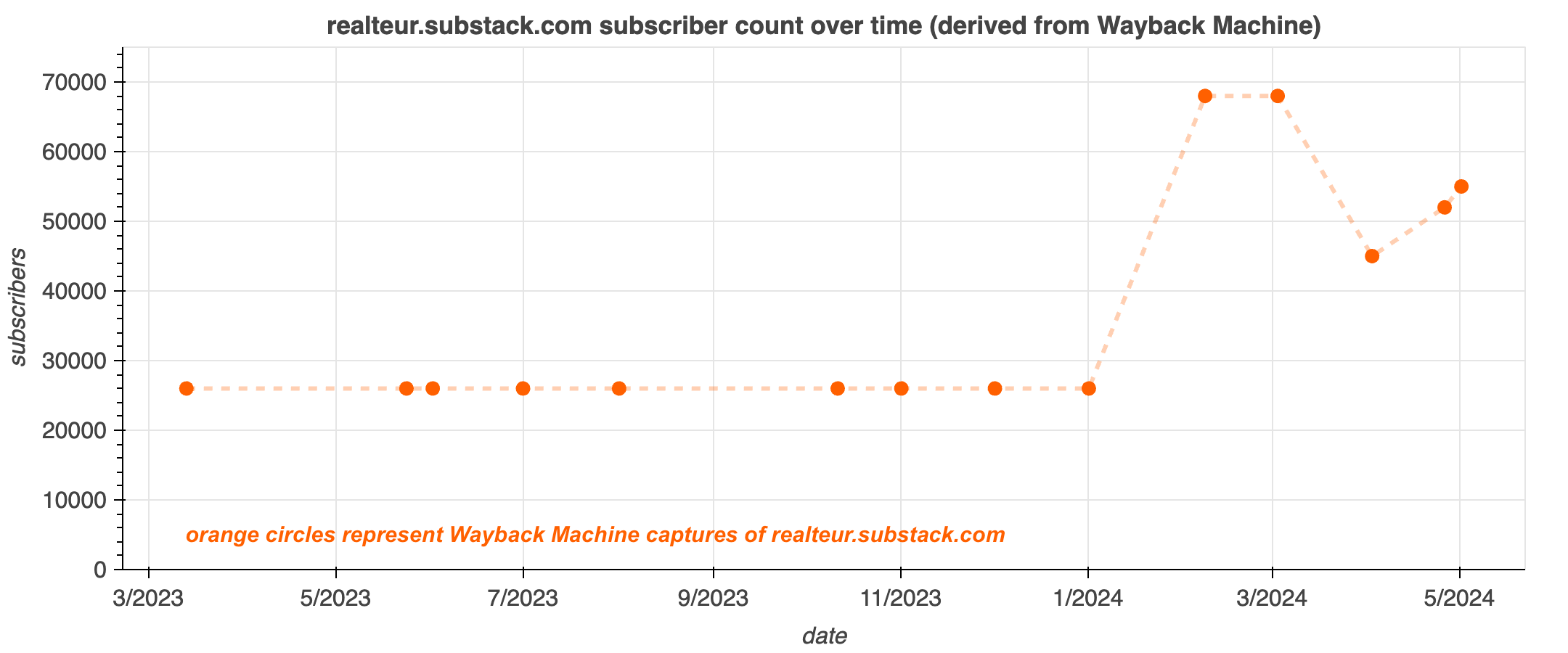 In a final interesting twist, the “Realtors @ Substack” blog’s subscriber count has been fluctuating dramatically thus far in 2024, after holding steady at around 26,000 subscribers throughout most of 2023. The blog’s readership skyrocketed to 68,000 subscribers by early February 2024, only to drop back down to 45,000 by early April, and bounce back somewhat to 55,000 as of May 2nd. (Subscriber counts were obtained from Wayback Machine captures.) Most of the posts get negligible engagement, and there are very few links to this blog on other websites, so it is plausible that the subscriber count for this blog is being inflated somehow, and that the recent drop of 23,000 subscribers was the result of some sort of anti-spam action by Substack. Other possible explanations exist as well.