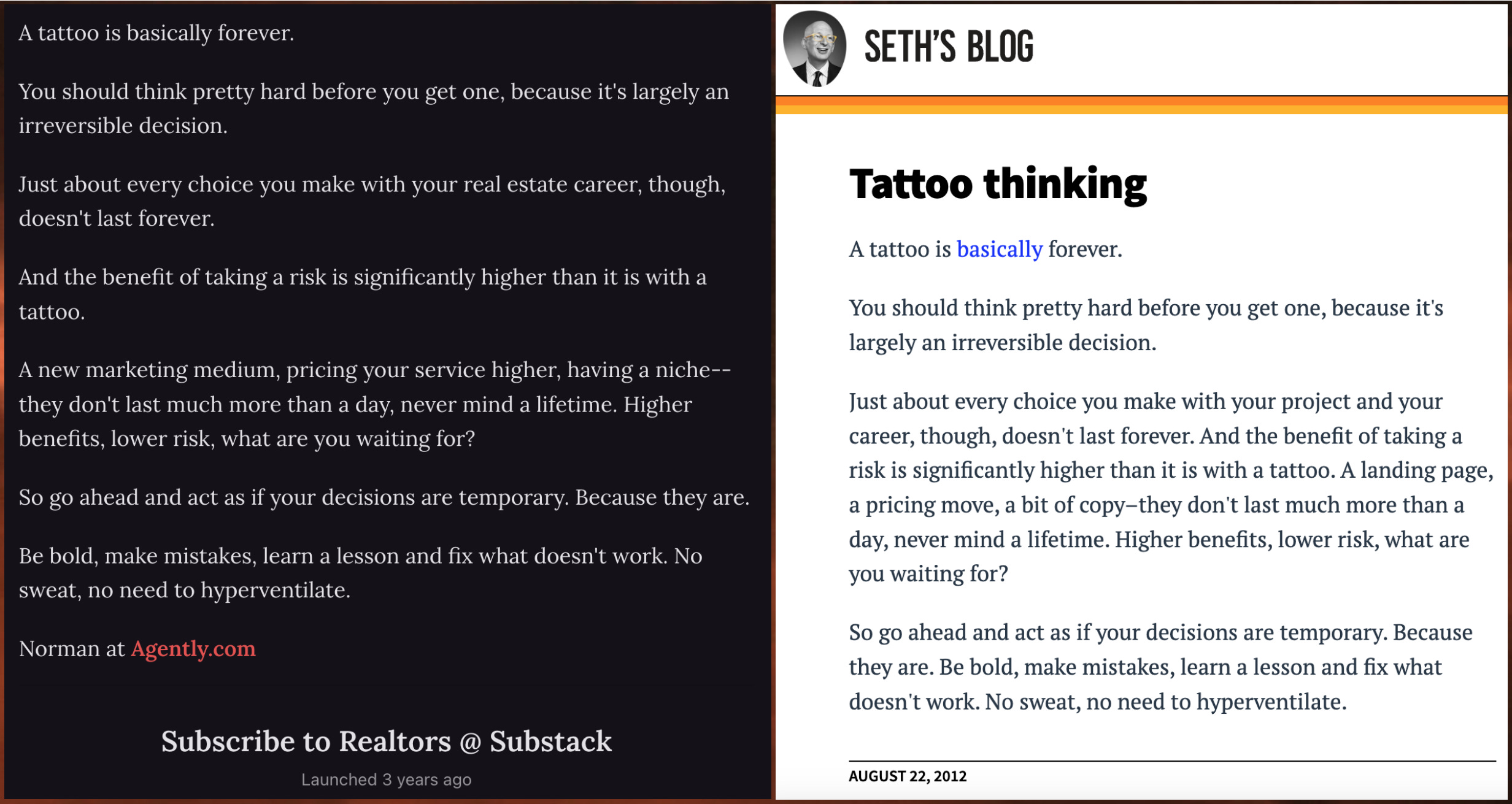 At least some of the content of the “Realtors @ Substack” blog is plagiarized from elsewhere on the Internet. For example, most of a September 2021 post with the title “Tattoo Thinking” is lifted almost word for word from an August 2012 post on a site called “Seth’s Blog”. The plagiarized version changes a couple of sentences and breaks the post into a larger number of paragraphs, but most of the content is identical. As with the oldest presently visible post, this post is signed “Norman” but presently shows the name “Alexa Grace Kern” on the byline.