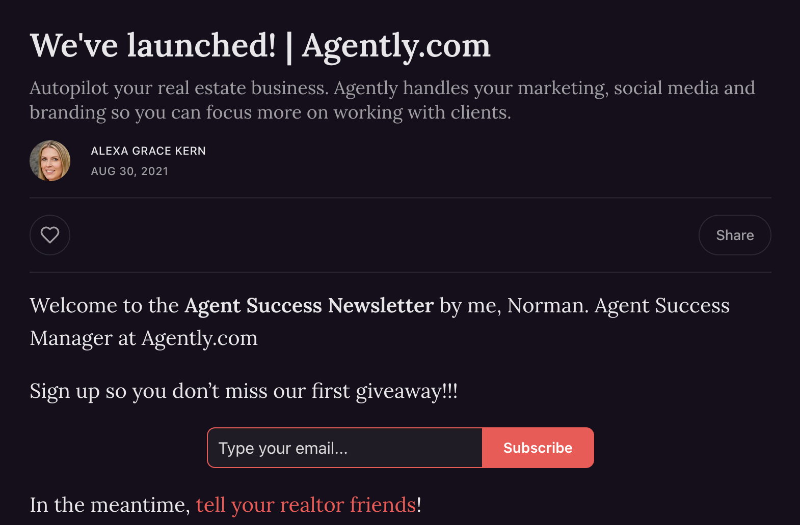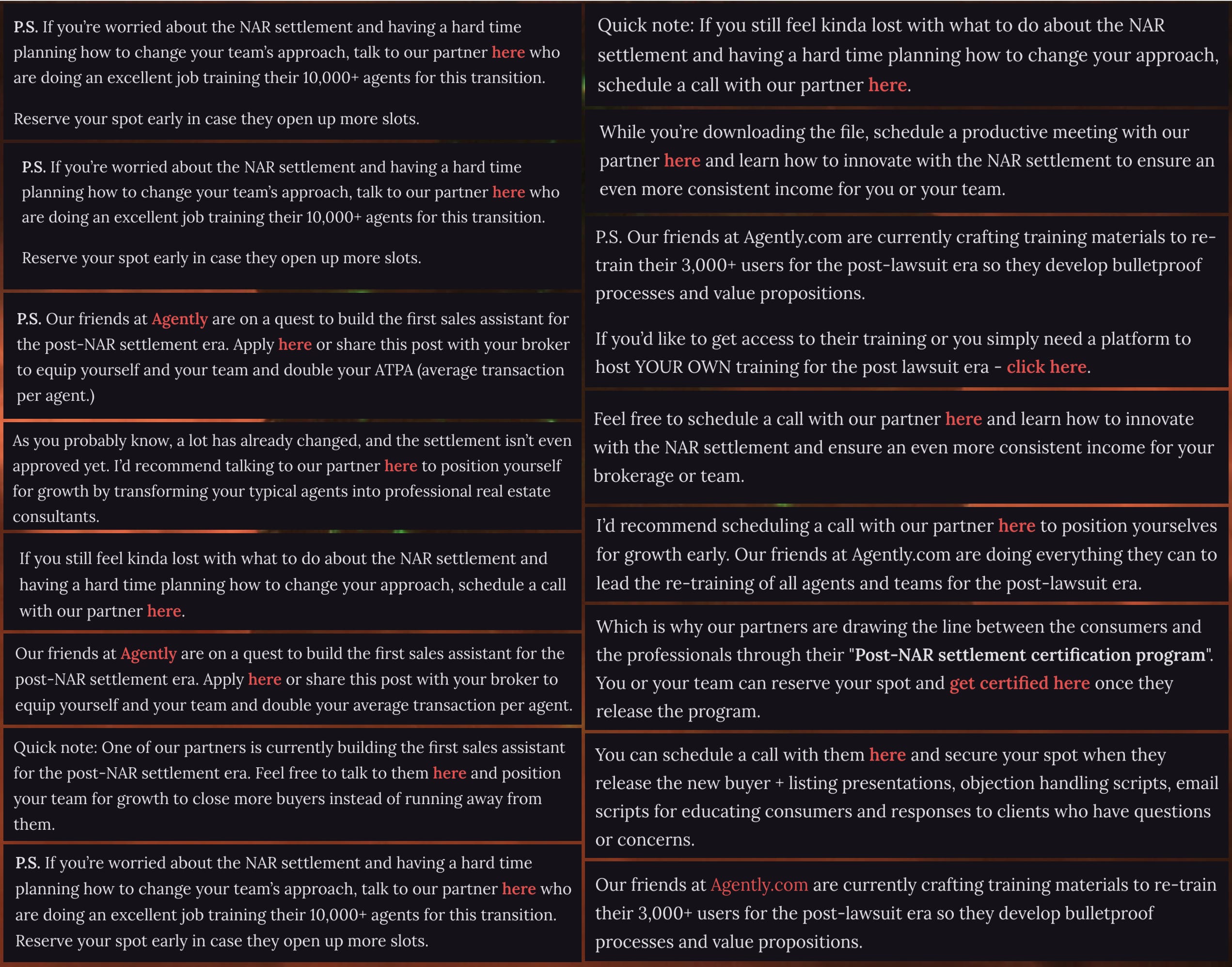 As it turns out, the “Realtors @ Substack” blog is full of links to Agently.com, and many of the posts promote the site’s services. This is particularly true of a recent flurry of posts regarding a lawsuit involving the National Association of Realtors; almost every post on this topic either begins or ends with a paragraph advertising Agently.com. It is reasonable to hypothesize that driving traffic to the Agently website is in fact the primary purpose of the “Realtors @ Substack” blog.