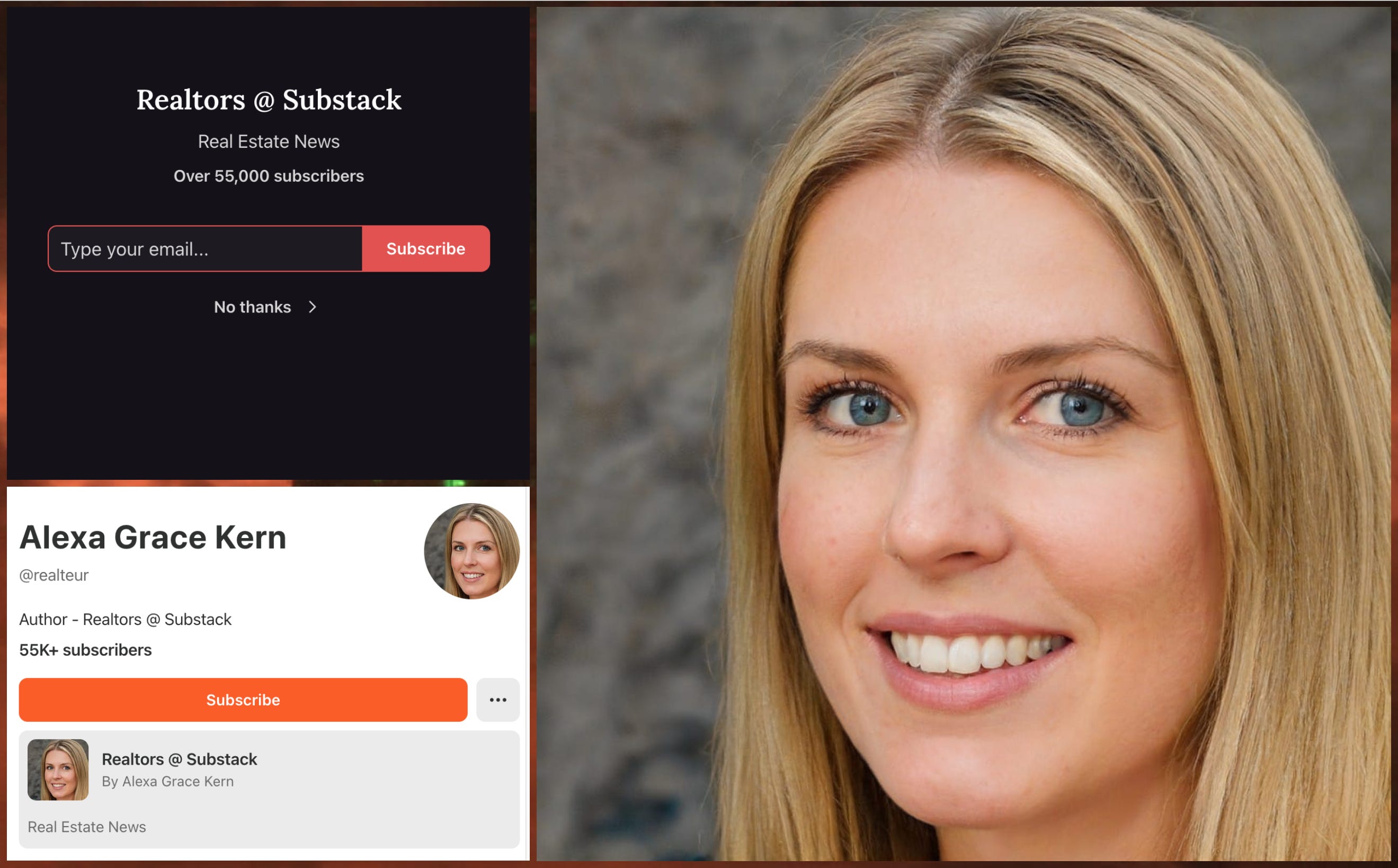 Meet Alexa Grace Kern, author of the reasonably popular real estate blog “Realtors @ Substack”, which boasts over 55,000 subscribers as of May 2nd, 2024. All is not as it seems, however, as Alexa Grace Kern’s profile photo is a StyleGAN-generated face, and DuckDuckGo and Google searches for the name “Alexa Grace Kern” turn up no evidence that anyone by this name exists, outside of material linking back to the blog in question. Additional problems turn up as one digs deeper: the blog’s subscriber numbers have fluctuated wildly up and down in recent months, multiple posts contain plagiarized content, and the author’s name has been changed on multiple occasions.