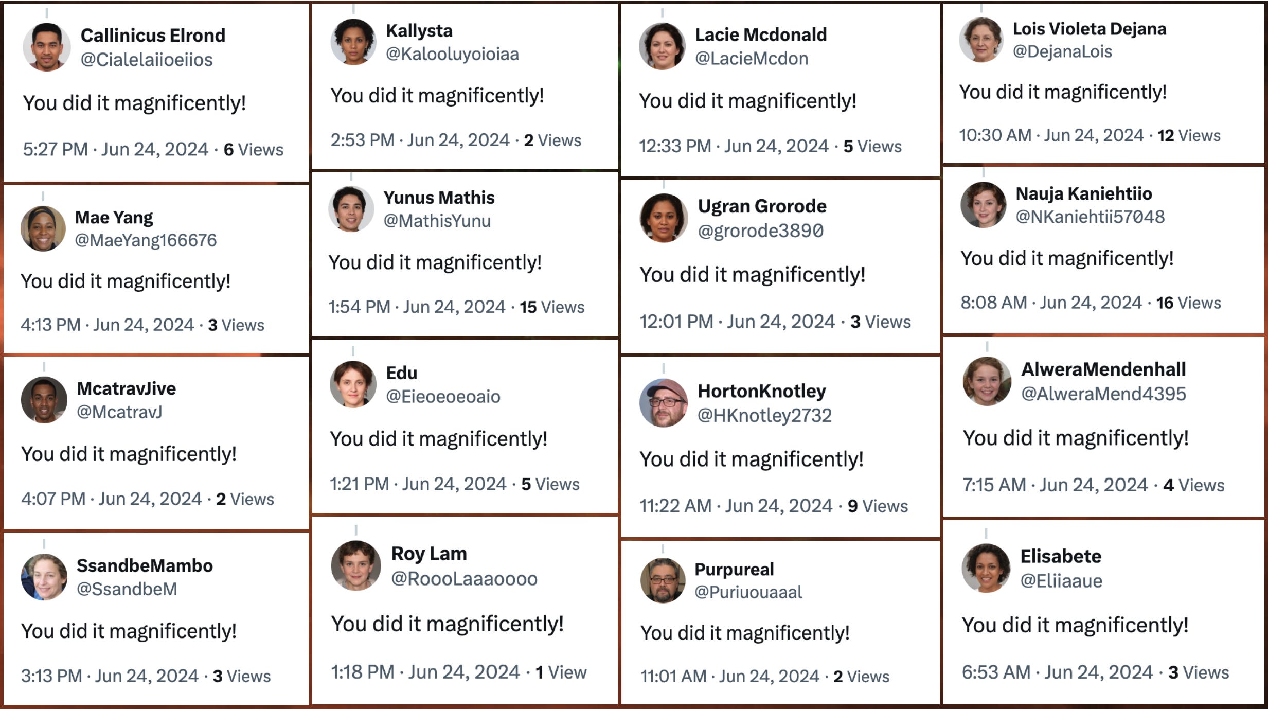 If you recently had a post go viral on X (formerly Twitter), you may have had a bunch of total strangers show up to reply to your post with extremely similar compliments. These replies, which simply consist of statements such as “You did it magnificently!”, “You did it perfectly!”, and “You did it superbly!” repeated ad nauseam, are from a spam network that appears to have kicked into high gear in early June 2024. This network primarily spews its spammy output in response to viral posts about AI or cryptocurrency, although it regularly branches out to other topics as well. Many of the spam accounts use artificially generated faces as profile images, while others use stolen photos that have also been used by previous spam networks.