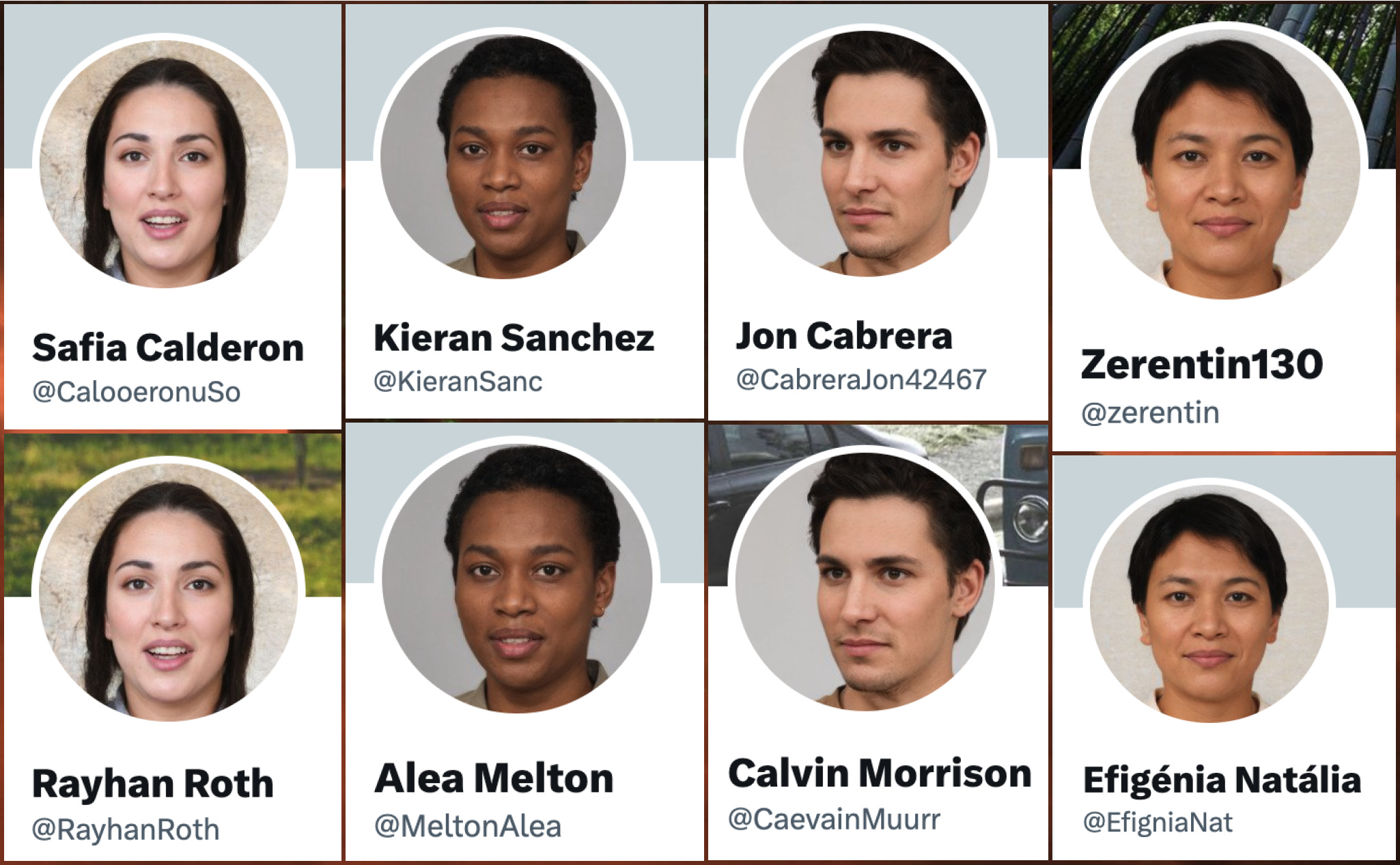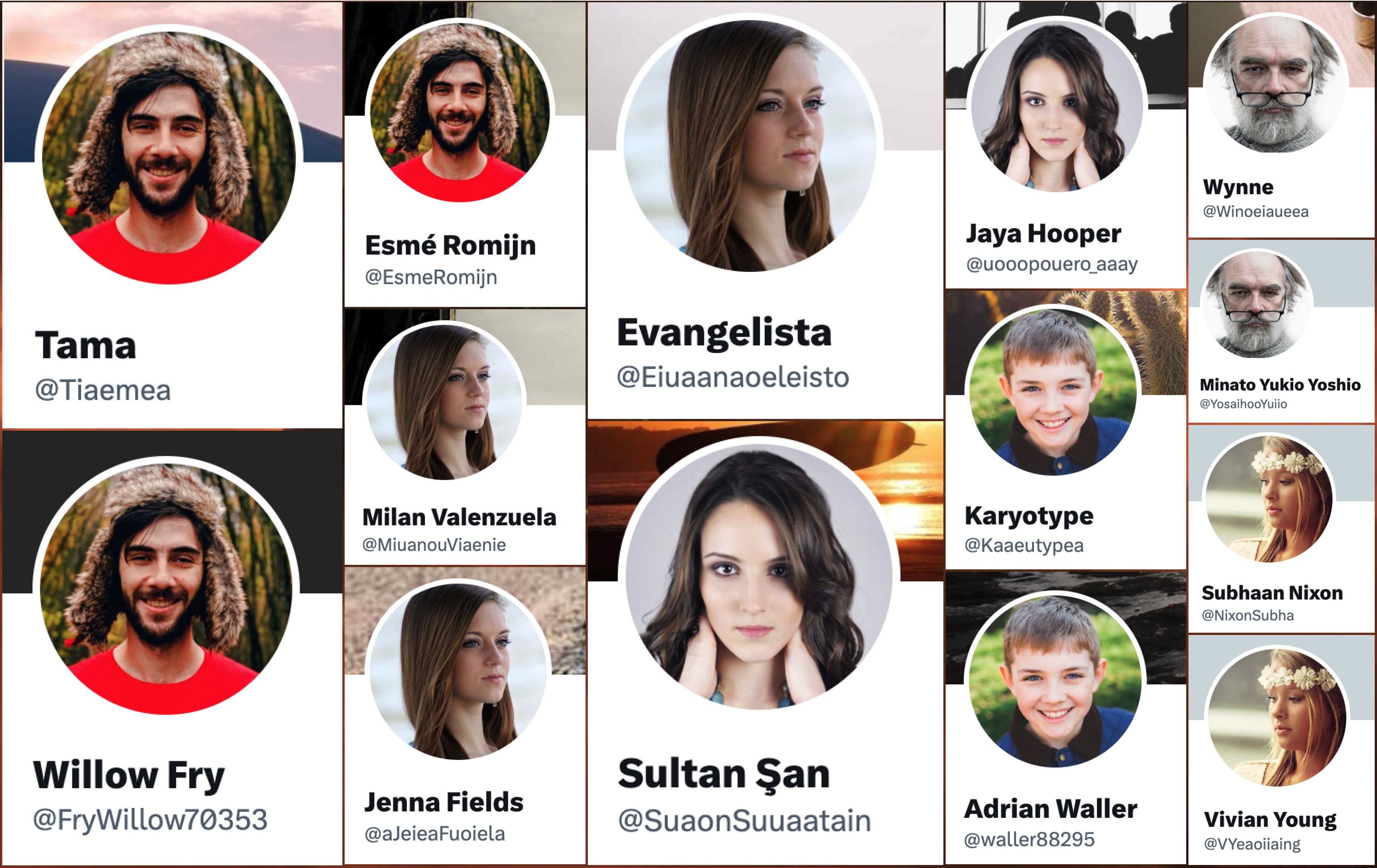 One benefit of using AI image generation tools such as StyleGAN to generate fake profile photos is that one can easily generate an endless number of unique images. Despite this, the operators of this network have in several instances used the same artificially generated face as the avatar for multiple accounts. The same is true of the plagiarized photos used by the network, several of which turn up as profile images for more than one account. Some of the plagiarized photos were also used as avatars by one of the network’s potential predecessors.